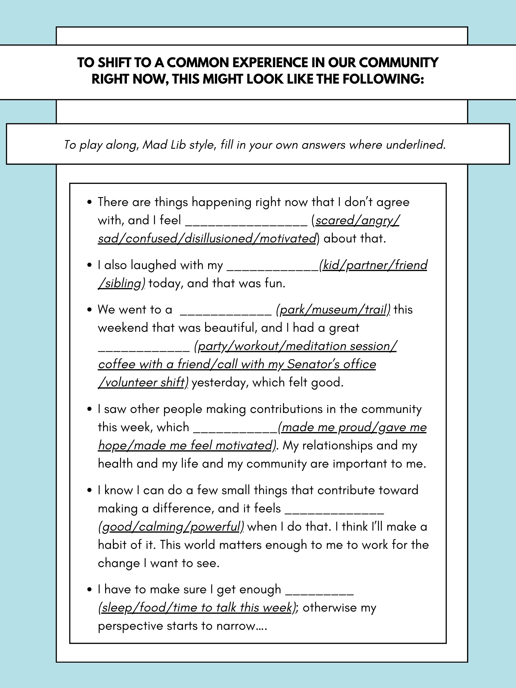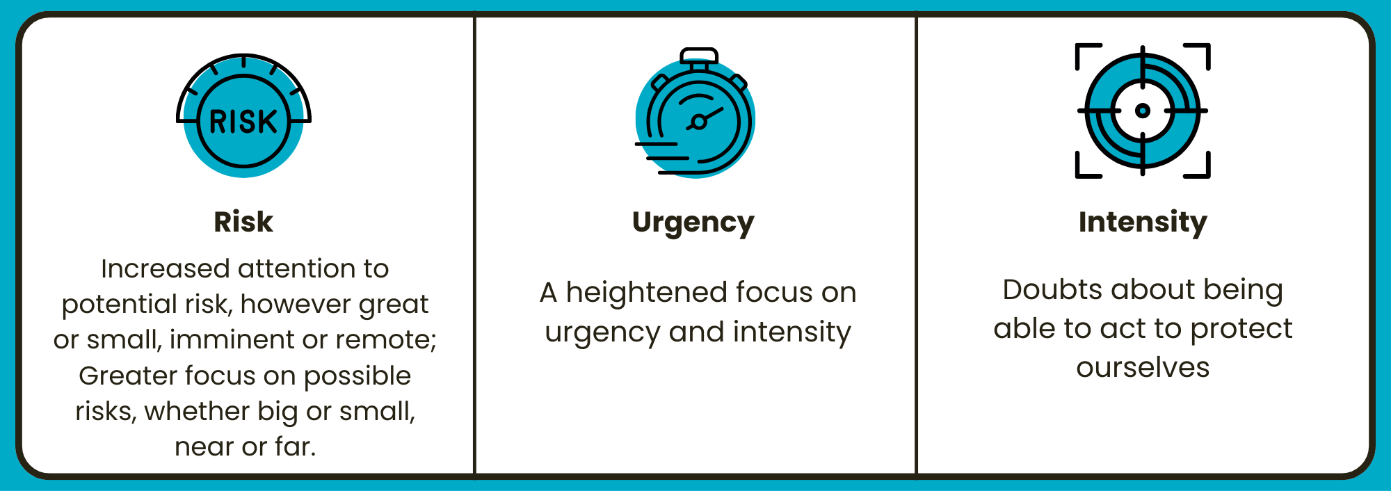 To feel more balanced and nimble, and to be ready to act in ways that help serve us and others well,we need to respond to the three concerns above - (1) risk, (2) urgency and (3) intensity. We do this by naming our own capacity to act with compassion on our behalf, which can sound like this:
