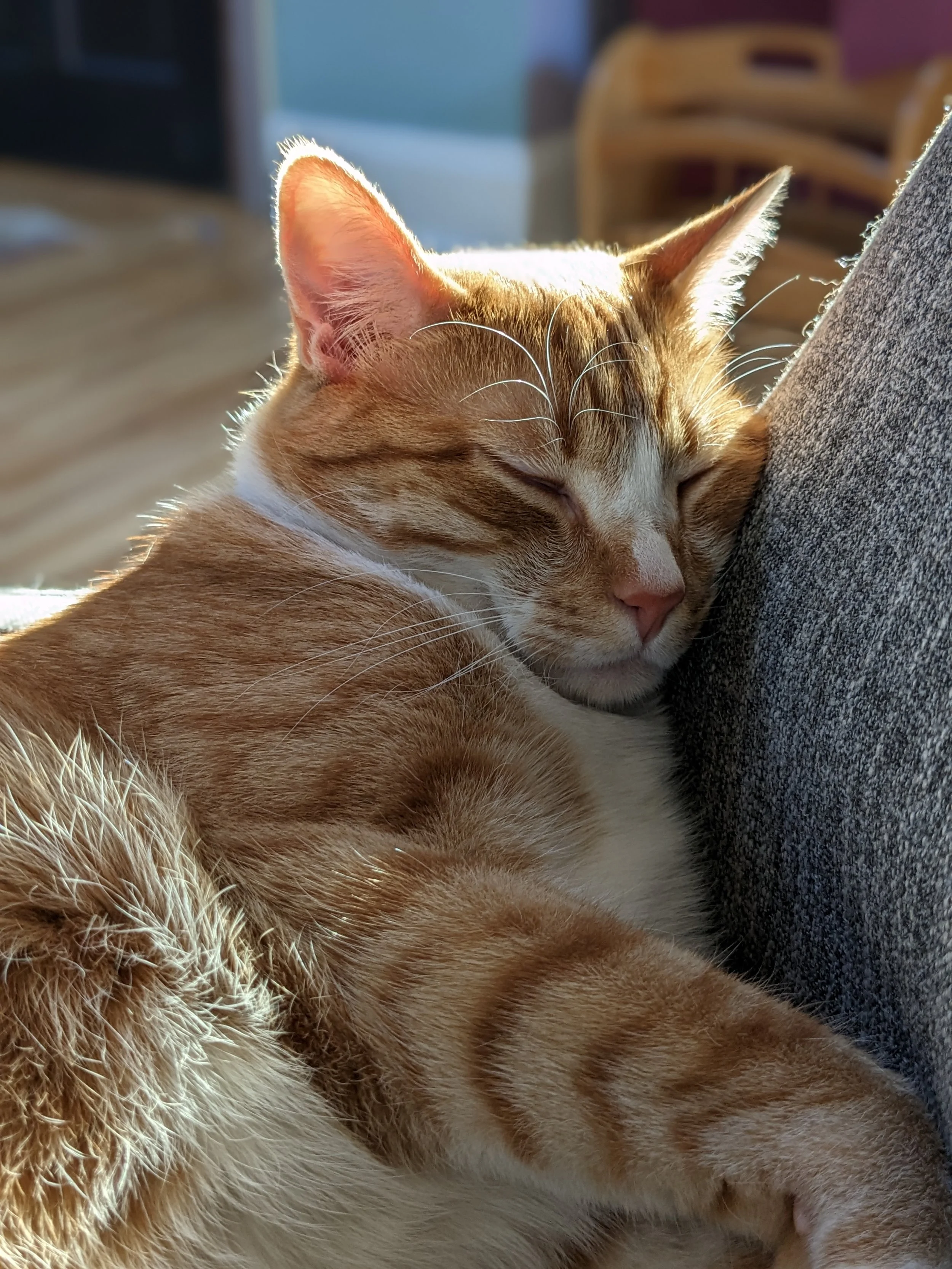 I am the sweeter half to my sibling, Thyme. I enjoy filling my days with rolling on the carpet, stretching out for tummy rubs and being loved and doted on. I work part-time coaching others on the ancient fine art of birdwatching…with hostile intent. Classes are open now so make sure you register soon! (Must be able to fit on the top platform of a standard cat tree and possess the patience to stare unblinking for several hours at a tree branch. Others need not apply.)